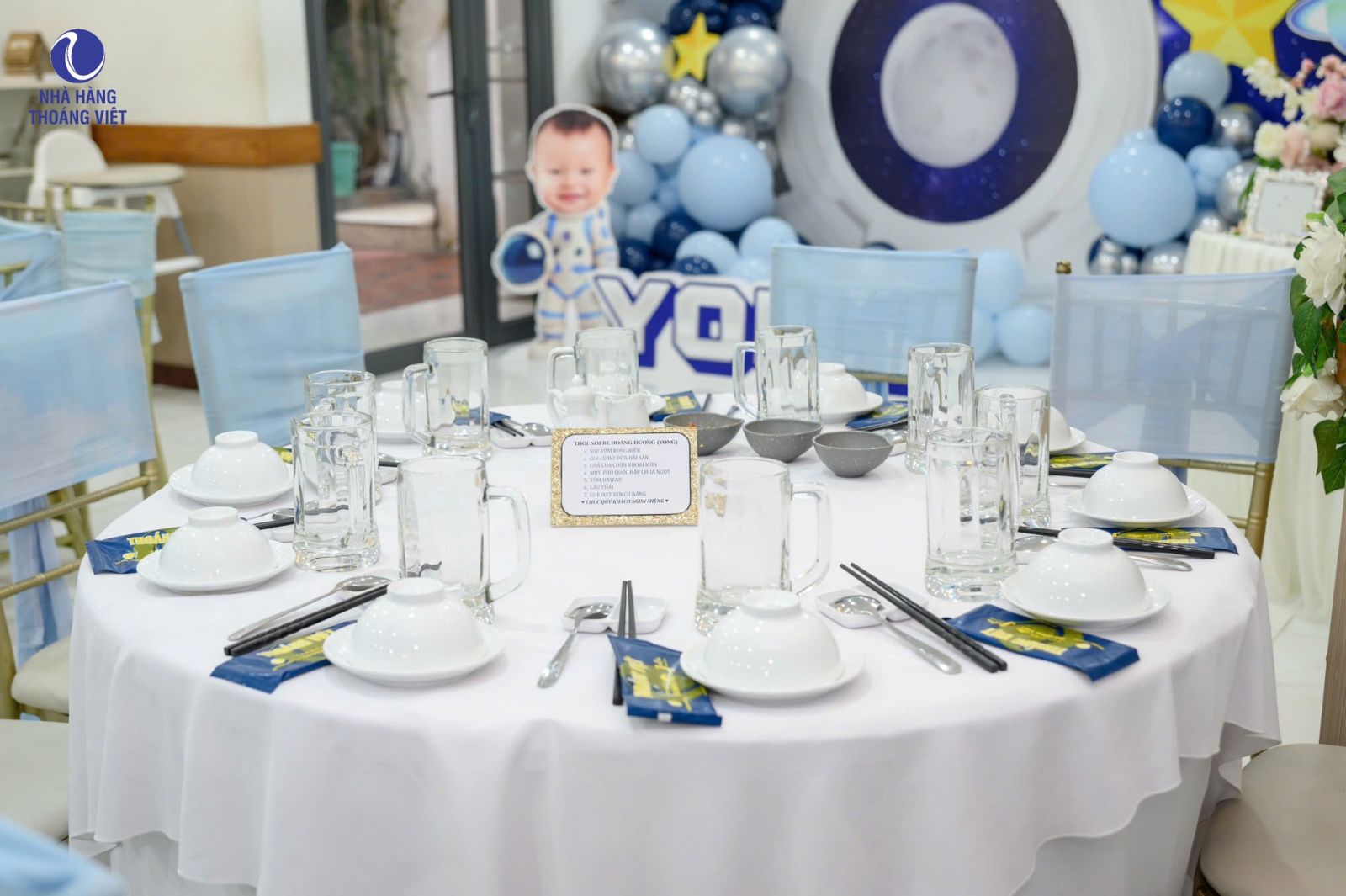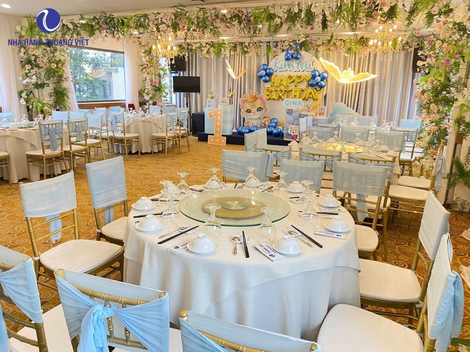 Hiểu được ý nghĩa sâu sắc ấy, Nhà hàng Thoáng Việt – Jolie mang đến không gian tổ chức thôi nôi được “dệt” nên từ màu sắc, ánh sáng và những câu chuyện cảm xúc. Tại đây, từng concept trang trí – từ xanh pastel, trắng ngọc trai đến ánh bạc thanh tao – đều được thiết kế để tôn vinh sự trong trẻo, thuần khiết và ngọt ngào của ngày đặc biệt đầu tiên trong đời bé yêu.